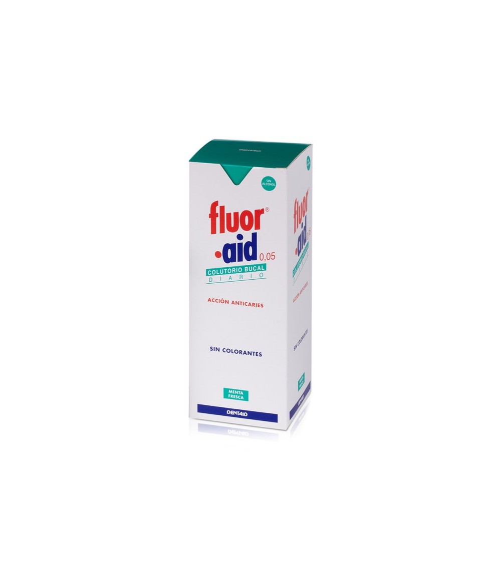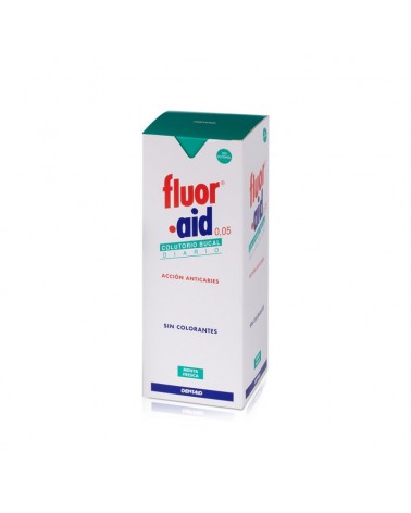 Fluor Aid 0,05 colutorio: Fluor·Aid 0,05 es un colutorio de una aplicación al día, con 0,05% de flúor, que reduce la aparición de caries y proporciona una sensación de boca fresca y limpia. Fluor·Aid 0,05 colutorio diario es indicado para prevenir la aparición de caries en niños mayores de 6 años y adultos.  Apto para personas celíacas.