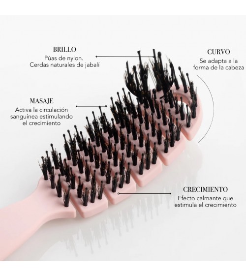 Estimula el cuero cabelludo, desenreda el cabello sin tirones, evita la rotura capilar, da brillo y moldea el cabello aportando volumen.