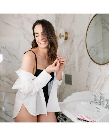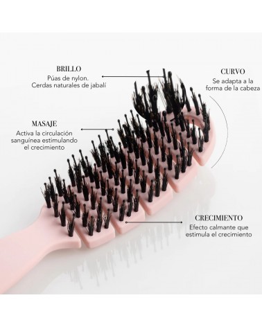 Da brillo, desenreda evitando la rotura capilar y tirones, deshace nudos, mejora el antiencrespamiento y estimula el riego sanguíneo del cuero cabelludo gracias a la forma curva que se adapta a la cabeza.