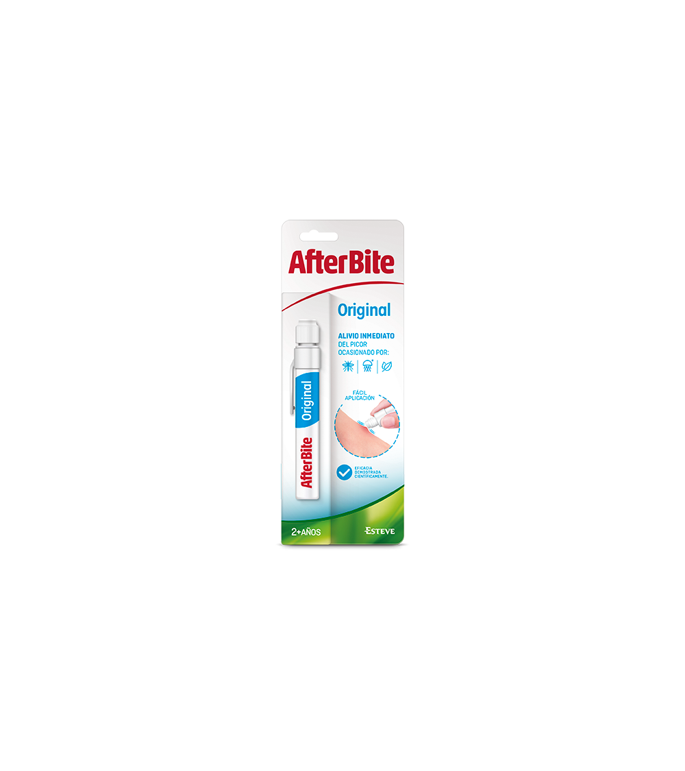 AfterBite Original alivia y calma de forma inmediata el picor ocasionado por insectos (mosquitos, avispas, abejas o tábanos), medusas* y plantas. Su formato lápiz roll-on es muy fácil de aplicar y de tener siempre a mano. Para toda la familia, niños a partir de 2 años. Eficacia demostrada científicamente. Contiene 0% de alcohol. Apto durante el embarazo. Testado bajo control dermatológico en pieles sensibles. No mancha y no reseca la piel.