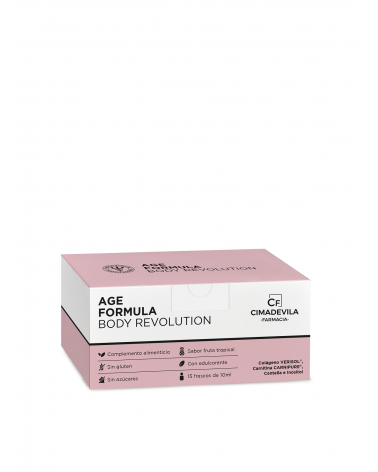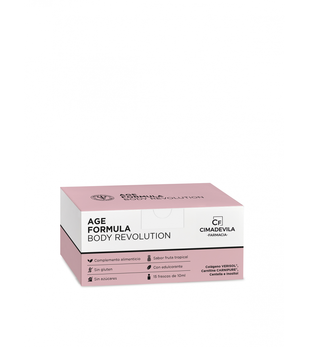 Cimadevila Age Formula Body Revolution es un complemento alimenticio  a base de Colágeno Verisol, Inositol, Carnitina Carnipure y Centella.