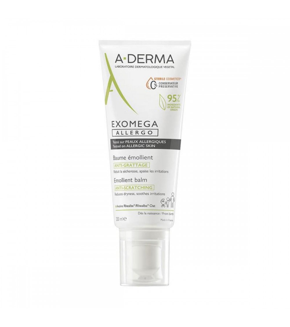 A-Derma exomega allergo 400ml: el bálsamo emoliente de cosmética estéril alivia el picor* y ayuda a reducir la frecuencia de las irritaciones, a la vez que reduce el enrojecimiento de las pieles secas con tendencia al eccema atópico. Probado en pieles alérgicas y en párpados secos con tendencia al eccema atópico.