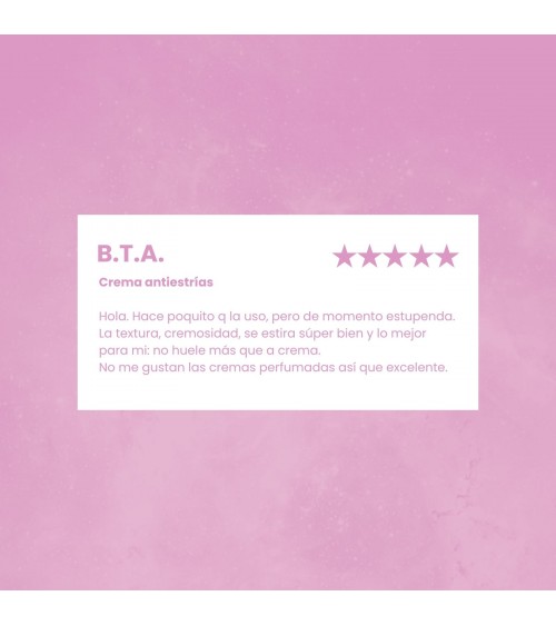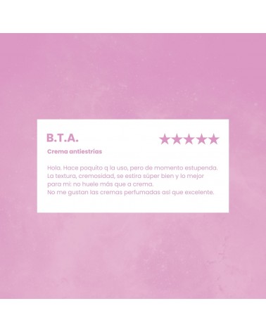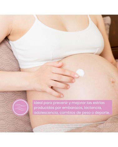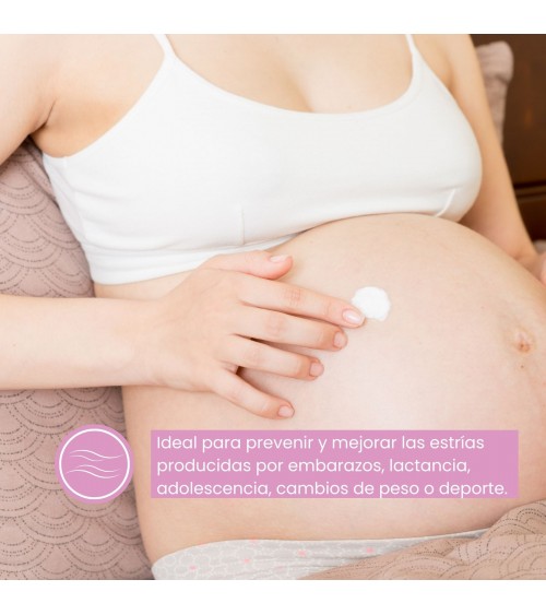 Proporciona a la piel las cuatro acciones cosméticas anti estrías más importantes: elasticidad, reparación, nutrición e hidratación.