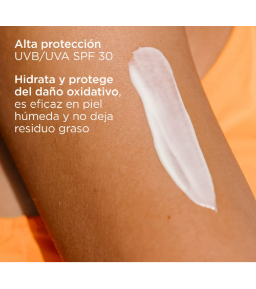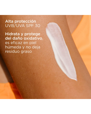 Protector solar corporal con textura gel crema que se absorbe rápidamente.