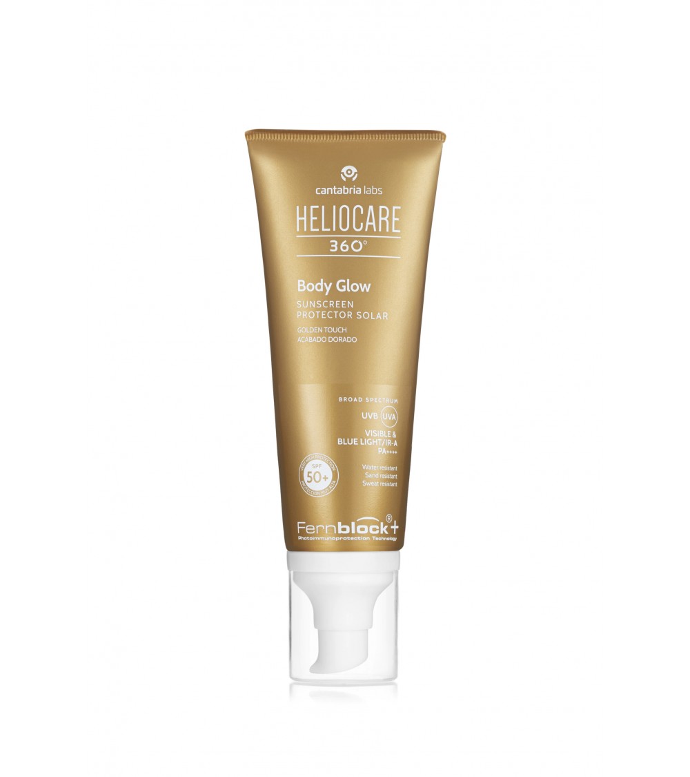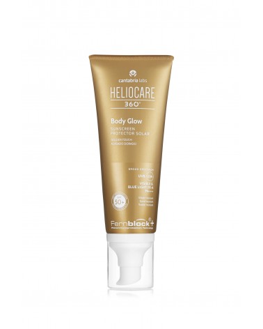Heliocare 360º Body Glow SPF 50+ es un muy alta fotoprotección corporal para prevenir el daño solar y los signos de envejecimiento asociados a éste, como las manchas de escote, etc…. Esta fórmula, con una innovadora textura en oleogel cremoso, incluye, además de la avanzada ciencia fotoprotectora de Heliocare, una exclusiva combinación de 6 micas que aportan a la piel un acabado dorado brillante apto para todos los tonos de piel.