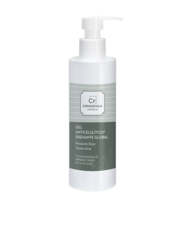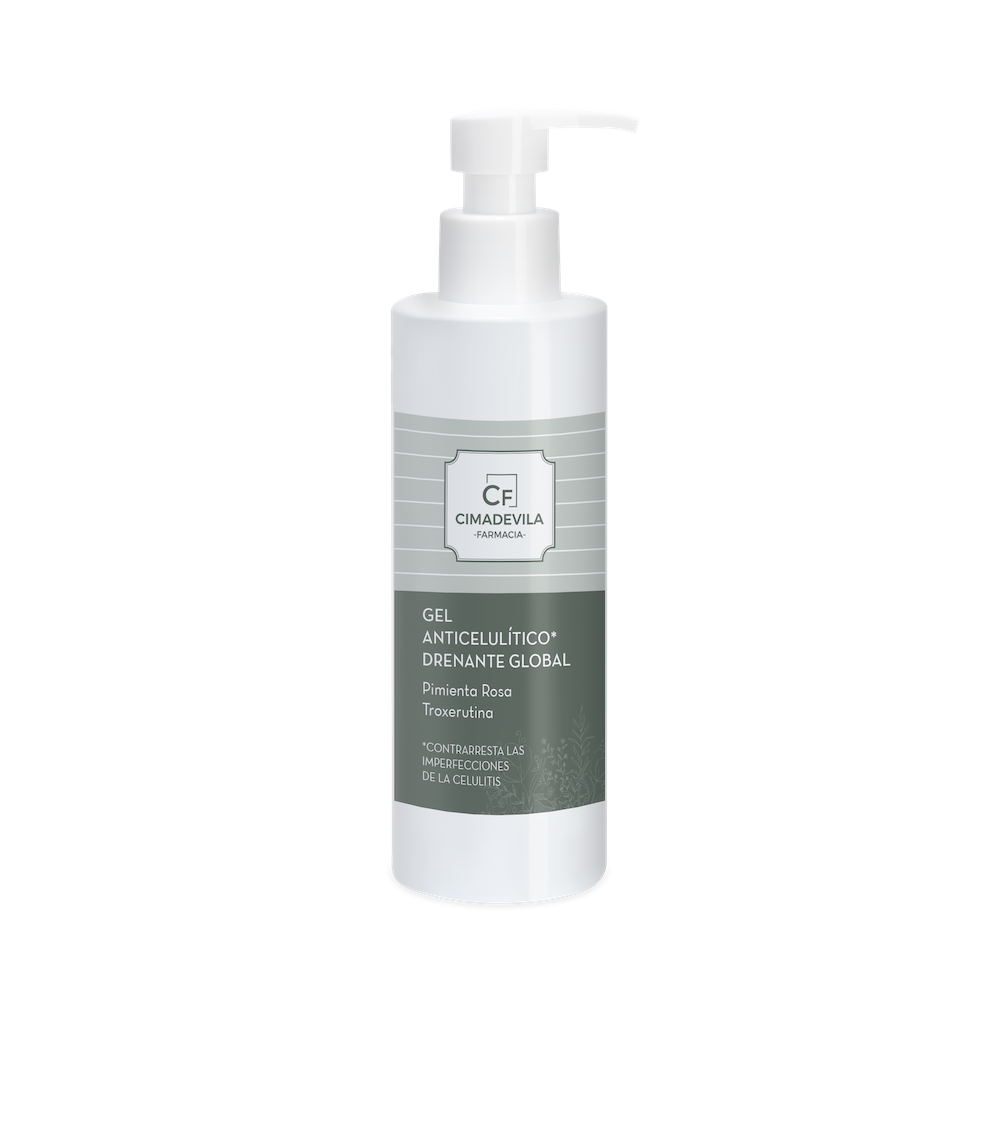El gel anticelulítico Cimadevila está formado por una combinación exclusiva de activos para una acción drenante y un efecto global frente a la celulitis. Acción anticelulitis potenciada sobre los distintos factores que la causan: acumulación de grasa, retención de líquidos y alteración de la microcirculación. La acción sinérgica de la Pimienta Rosa y la Cafeína presentes en la fórmula, actúa a tres niveles sobre la acumulación de grasas: limita la formación de adipocitos maduros, contrarresta el almacenamiento de nuevos lípidos y disuelve la acumulación de grasa que causa la celulitis en bloques más pequeños y, por lo tanto, más fáciles de eliminar. La Troxerutina completa la acción: drenante, vasoprotectora y antiinflamatoria; contrarresta la retención de líquidos (edema) y la inflamación.