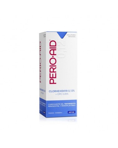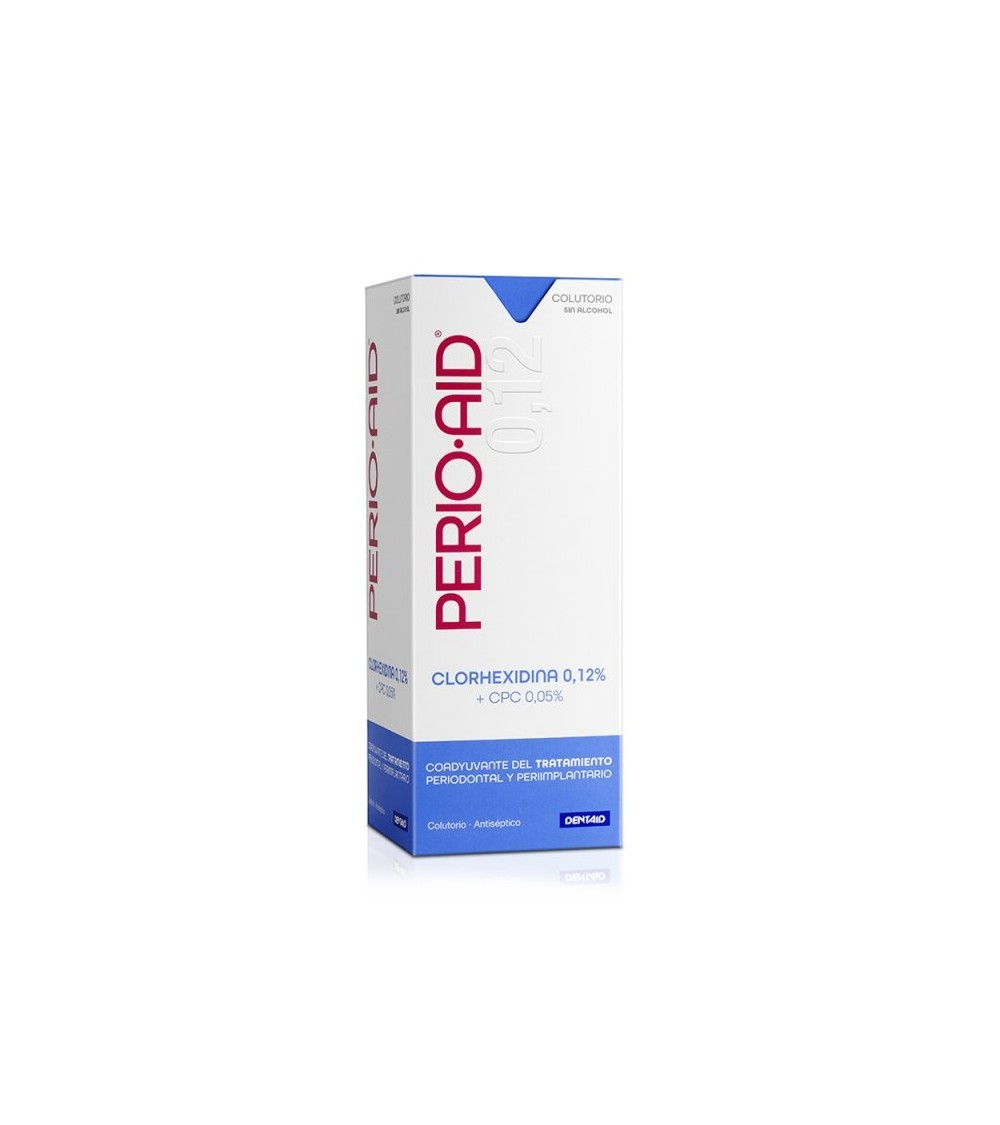 Perio Aid tratamiento colutorio: PERIO·AID 0,12% tratamiento colutorio es un antiséptico bucal coadyuvante al tratamiento de las enfermedades periodontales y periimplantarias a base de Clorhexidina 0,12% (CHX) y Cloruro de Cetilpiridinio 0,05% (CPC). PERIO·AID 0,12% tratamiento colutorio, gracias al efecto sinérgico de la CHX y CPC, garantiza la eliminación de las bacterias patógenas que causan las enfermedades periodontales y periimplantarias, tras el tratamiento específico en la clínica. Además, numerosas investigaciones científicas avalan su eficacia.