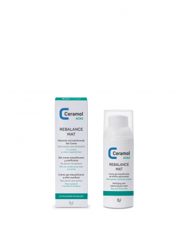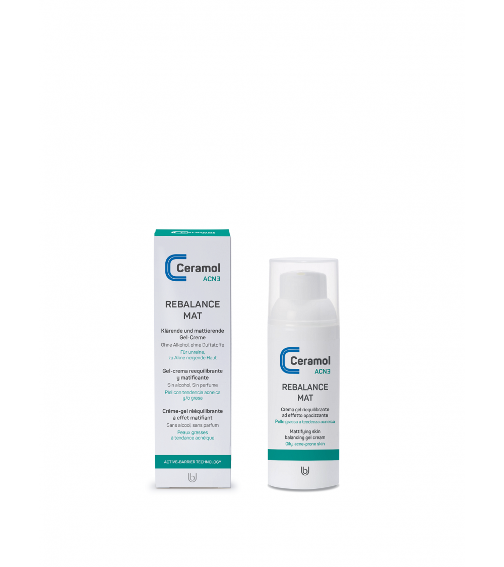 Ceramol Acné Rebalance Mat es un gel-crema reequilibrante para pieles acneicas y/o grasas sensibles con efecto matificante que seborregula, calma, y reestructura la piel mejorando las imperfecciones y marcas. Textura ligera oil-free no comedogénica.