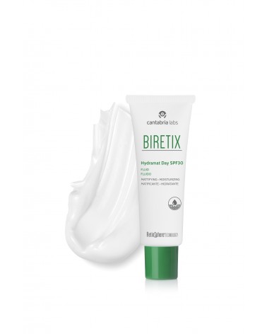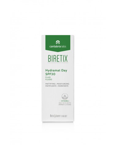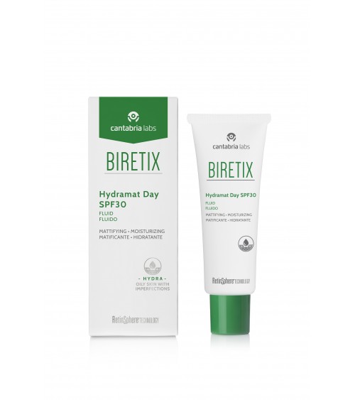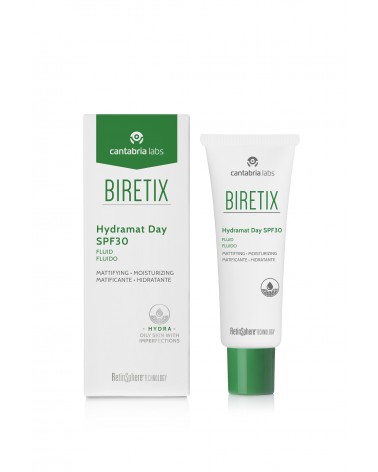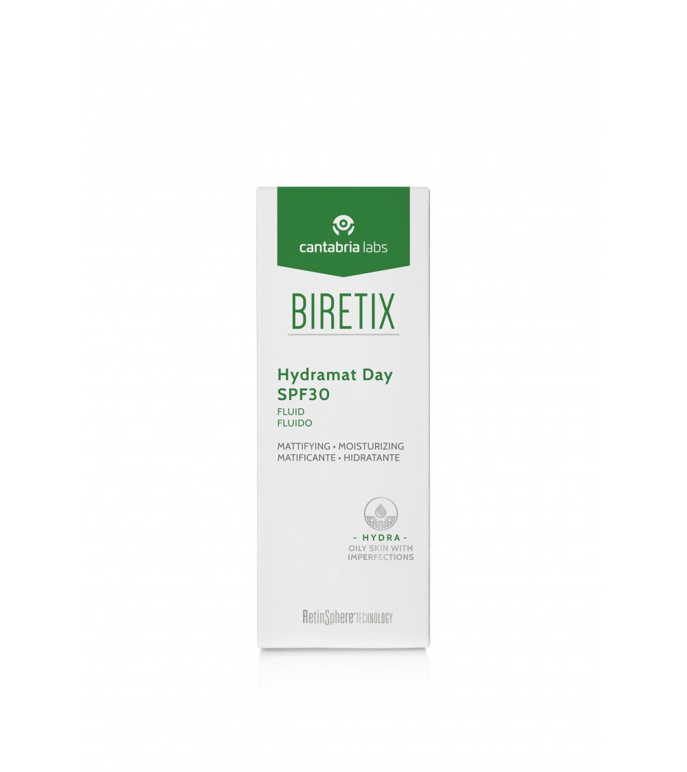 Biretix Hydramat Day SPF 30 es un fluido ligero oil free de rápida absorción, único en el mercado gracias a la combinación de sus activos y Retinsphere® Technology, especialmente indicado para el cuidado diario de las pieles grasas y/o pieles con tendencia acneica. Restaura la hidratación y la función barrera de la piel deshidratada y sensibilizada, reduce el sebo y el brillo para ayudar a tener una piel limpia y saludable y, además, previene del daño producido por la radiación UV proporcionando una protección solar con SPF 30.