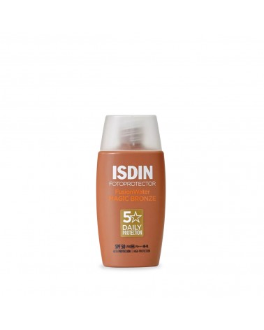 Isdin Fusion Water Bronze es un protector solar facial con color. Gracias a su fórmula ultraligera, protege tu piel a diario contra los rayos UVB y UVA (SPF 50). Aporta una cobertura natural que disimula imperfecciones, unifica el tono y proporciona un efecto buena cara. ¿Lo mejor? No irrita los ojos.