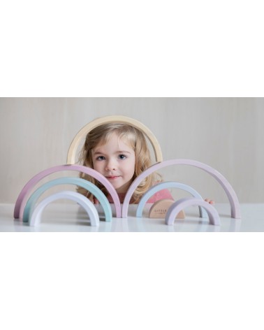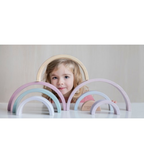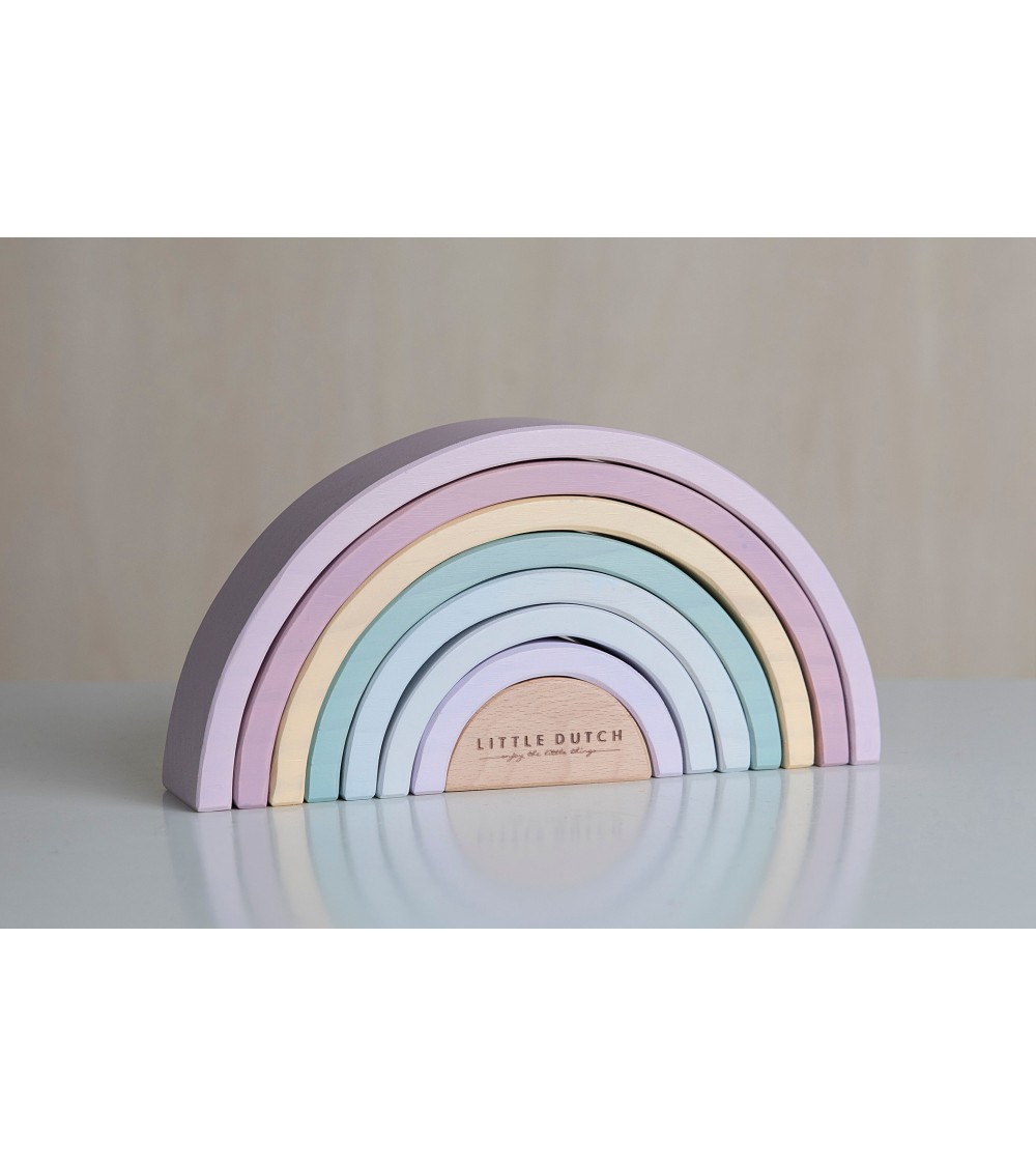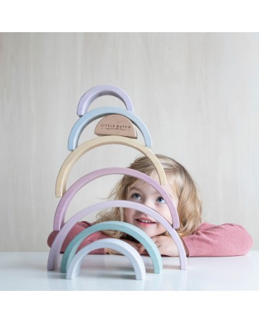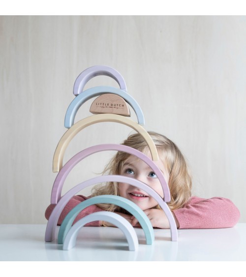 Little Dutch arco iris pure&nature: Este arco iris de madera es una torre apilable en forma de un hermoso arco iris. Los niños pueden usar estas formas semicirculares para jugar y aprender al mismo tiempo. Pueden apilar los arcos o utilizar su imaginación para hacer todo tipo de creaciones, como un túnel de tren, una casa para muñequitas o puentes para pequeños coches. ¡Hay infinitas posibilidades!