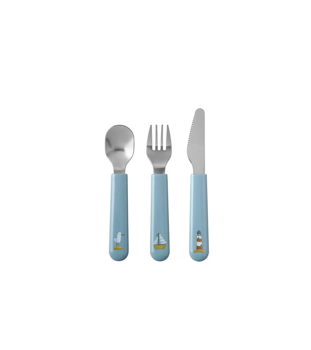 Little Dutch cubiertos infantiles azul: ¡Corta, revuelve, pincha y muerde! Este juego de cubiertos Mepal Mio de 3 piezas es un excelente comienzo para cuando su niño pequeño esté listo para alimentarse solo. Gracias al color azul claro y las ilustraciones de Sailors Bay, todos en la mesa saben de quién son los cubiertos. Los cómodos agarres se adaptan perfectamente a las manos pequeñas y el tenedor y la hoja están diseñados para ser seguros para niños a partir de los 12 meses. La autoalimentación es un gran paso en el desarrollo de su hijo. Recoger una cuchara o un tenedor desarrolla la coordinación mano-ojo, las habilidades motoras finas y también la confianza. Así que anímate y prueba esos deliciosos sabores por tu cuenta.