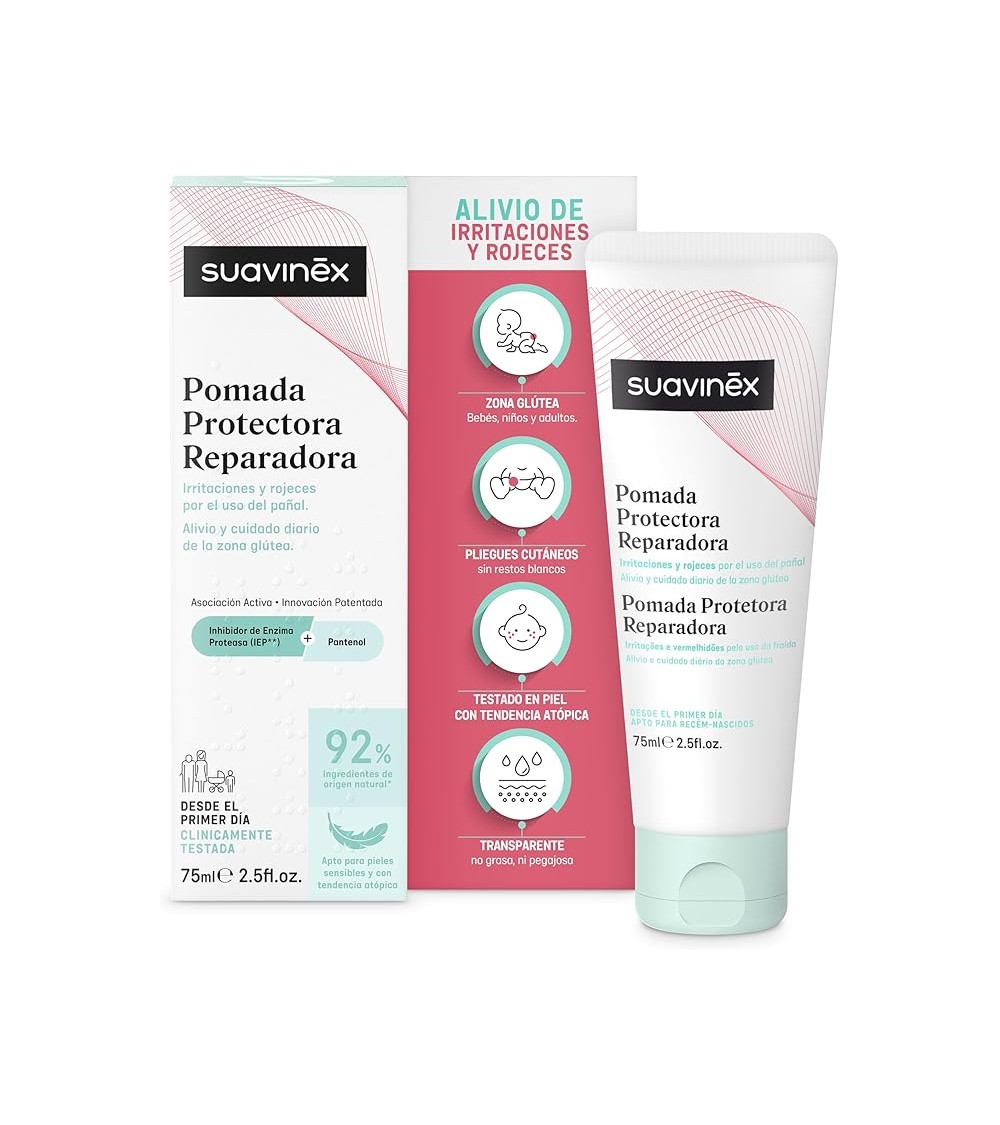 La Suavinex Pomada Protectora Reparadora es ideal para proteger y reparar la delicada piel del bebé. Formulada con ingredientes naturales, esta pomada alivia irritaciones y previene las rozaduras, garantizando el máximo cuidado y confort.