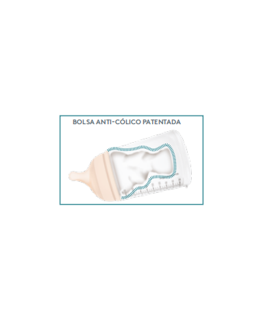 TETINA DE SILICONA DE GRADO MÉDICO, CUERPO DEL BIBERÓN DE POLIPROPILENO (PP) LIBRE DE BPA, VÁLVULA ANTICÓLICA DE SILICONA.