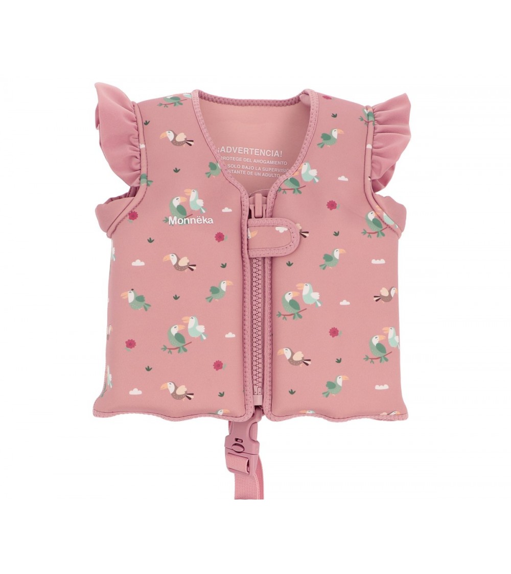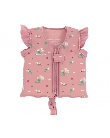 Chaleco flotador con diseño tropical de tucanes, ideal para que los más peques de 2 a 3 años empiecen a familiarizarse con el agua de forma segura y divertida.