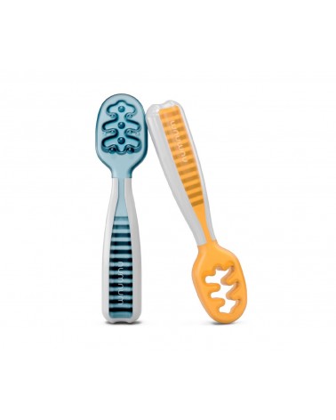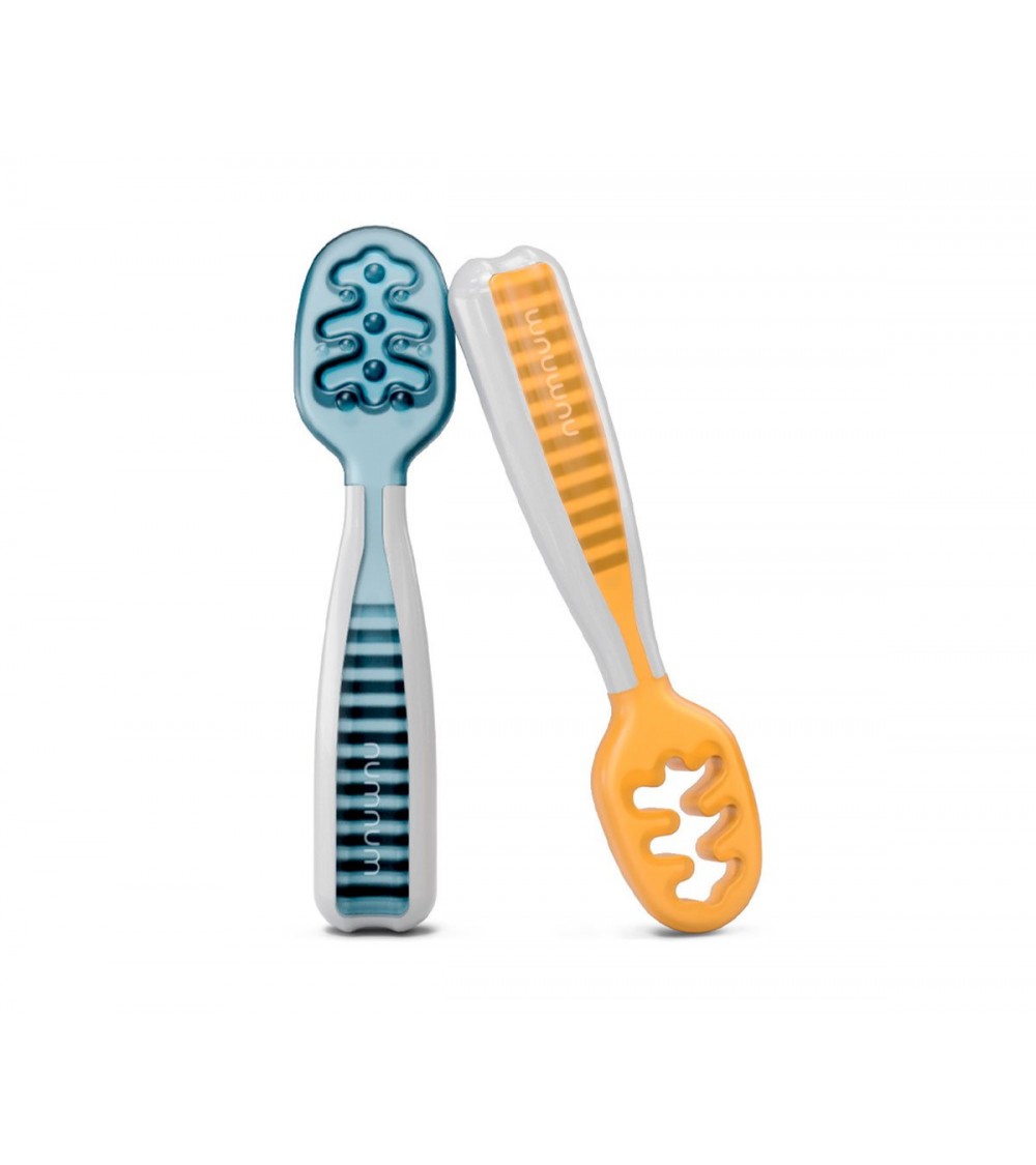 Pack de dos pre-cucharas para bebés, diseñadas para facilitar el inicio de la alimentación autónoma desde los 6 meses. Sin riesgo de atragantamiento.