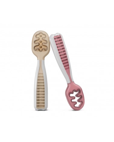 Set de dos pre‑cucharas de silicona para bebés, color beige/mauve, diseñado para favorecer el auto‑alimentación desde los 4 meses con un formato ergonómico seguro.