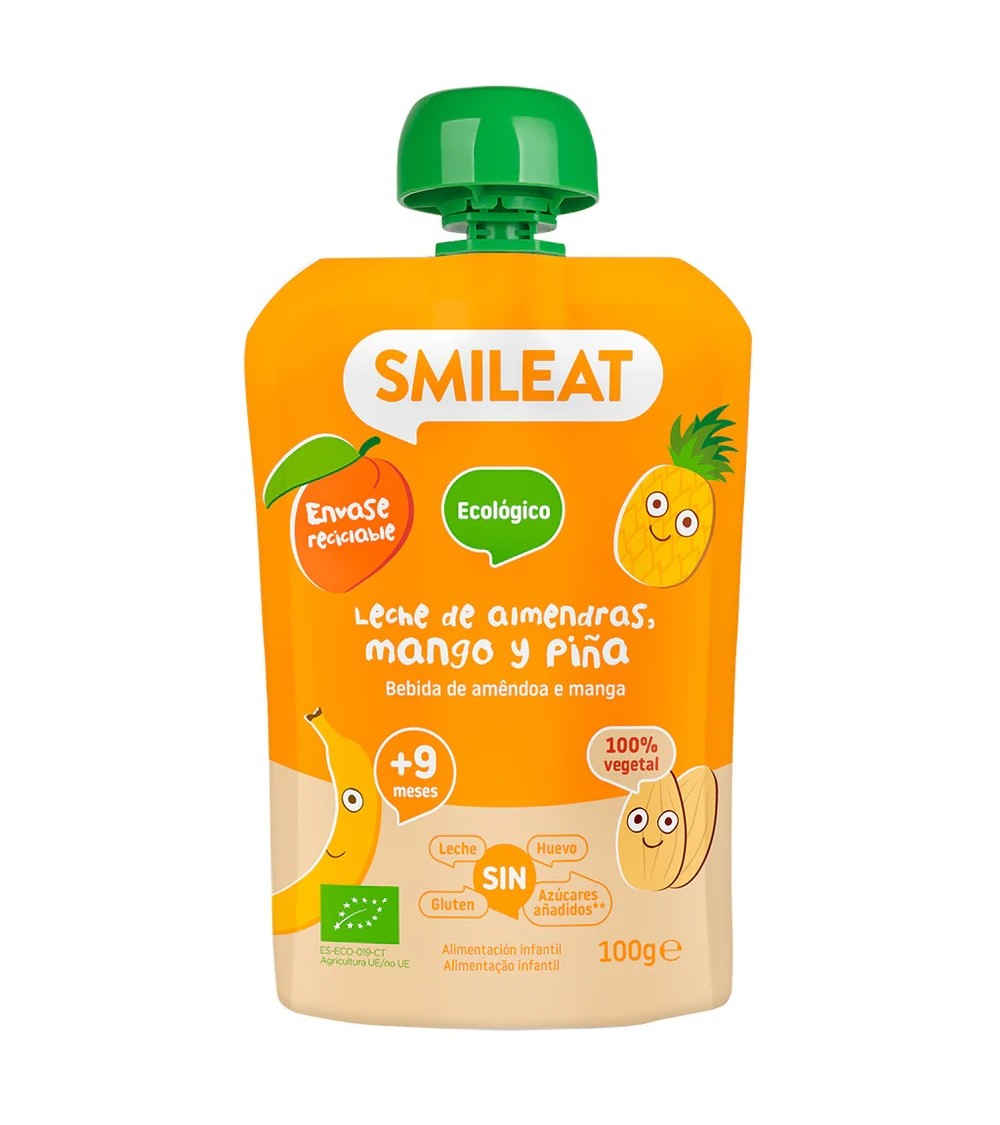 El Smileat Pouch de Leche de Almendras, Mango y Piña es un alimento ecológico infantil diseñado para aportar energía, nutrientes y sabor de forma natural. Su receta combina leche de almendras con una selección de frutas tropicales como mango, piña y plátano, aportando una textura cremosa y un sabor suave que encanta a los más pequeños.