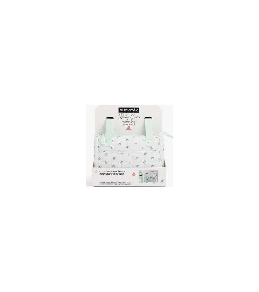 El Suavinex Baby Care Mini Bag Color Verde es un conjunto cosmético completo pensado para los cuidados diarios del bebé. Incluye gel baño espumoso 300 ml, champú extra-suave 100 ml, toallitas Aqua Care 60 unidades, leche hidratante corporal 100 ml y colonia infantil 50 ml. Todos los productos están formulados para pieles sensibles, con ingredientes naturales, y aptos desde el nacimiento.