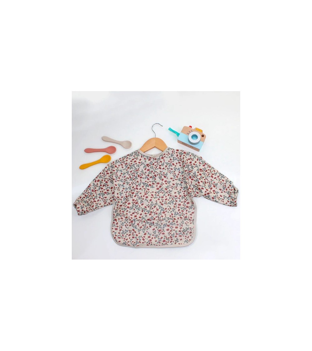 Protección completa para comidas, manualidades o juego, con estampado floral y práctico bolsillo recogedor.