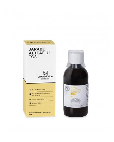 Cimadevila Jarabe Alteaflu Tos es un producto sanitario a base de miel y Polisedox, un complejo innovador rico en polisacáridos de acción emoliente y calmante de las vías respiratorias altas.