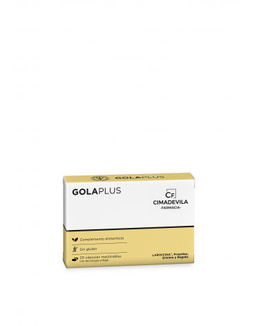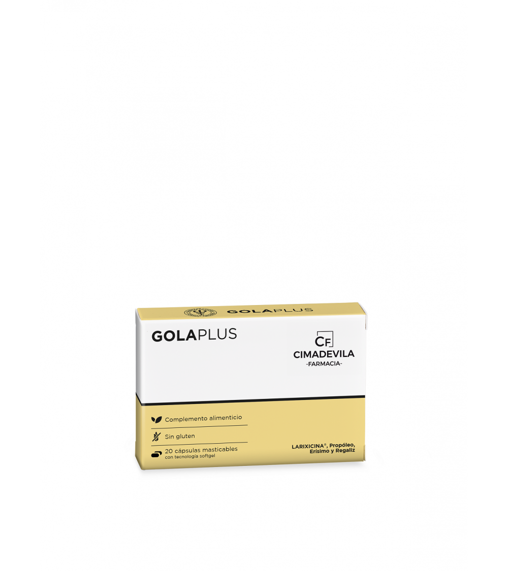 Cimadevila Golaplus es un Complemento alimenticio a base de extracto de Alerce larixicina, Propóleo, Erísimo y Regaliz. Contrarresta el dolor de garganta, la pérdida del tono de la voz y la irritación de la cavidad oral. Gracias a la larixicina desempeña una acción antibacteriana.