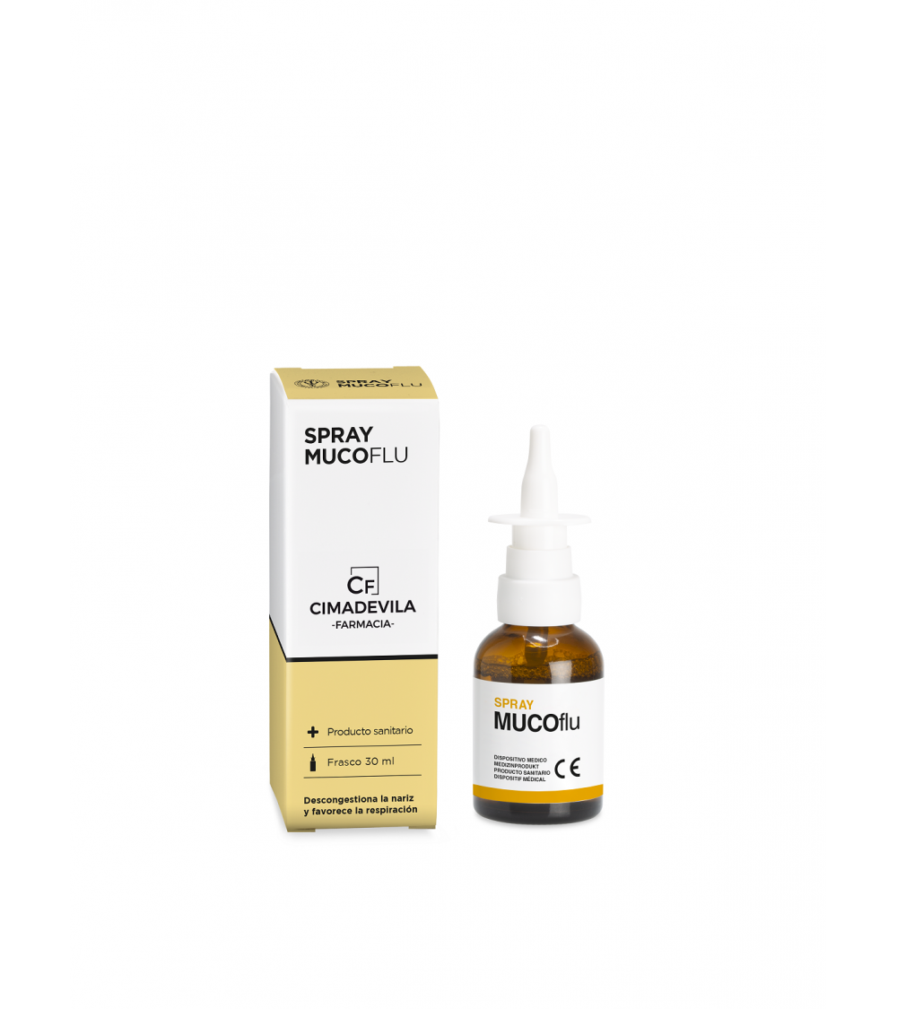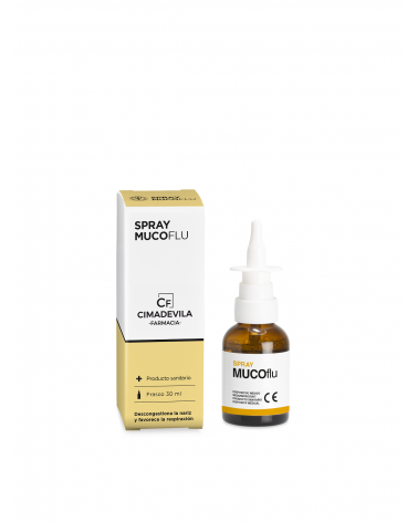Cimadevila Mucoflu spray es una solución para irrigación nasal a base de Ácido hialurónico, N-Acetilcisteína y Aceite esencial de Eucalipto. Útil para fluidificar el exceso de mucosidad e hidratar la mucosa en caso de congestión.